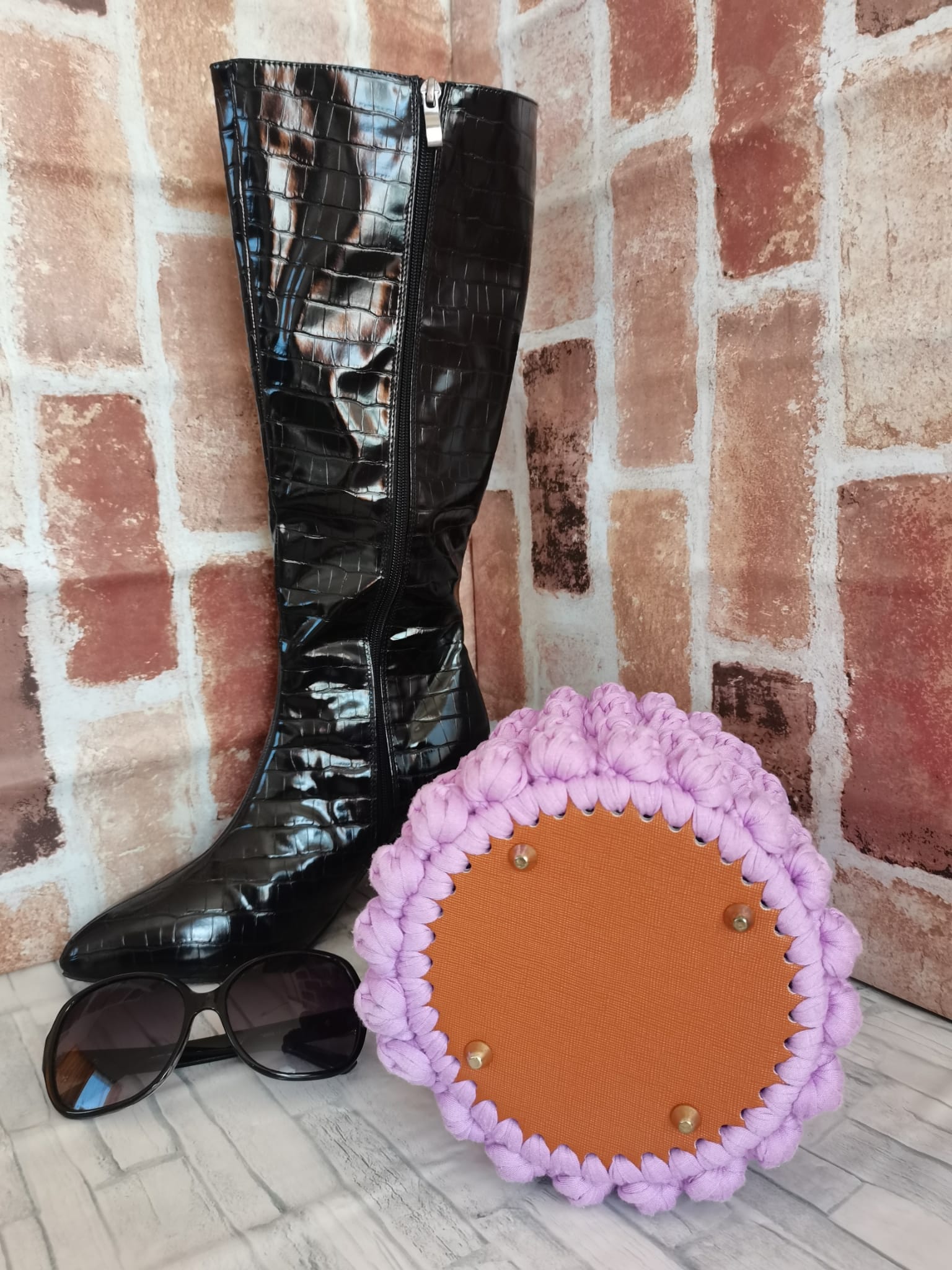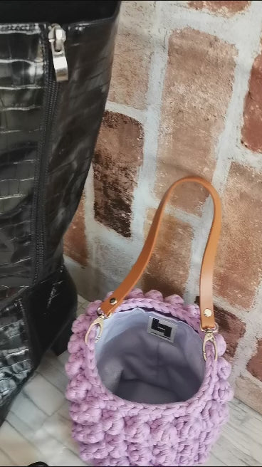 Elevate your style with the Candy Bag, a delightful blend of durability and fashion, inspired by special crochet stitches that resemble popcorn or candy. Its unique cylindrical design and lilac purple color make it a standout accessory for any occasion.