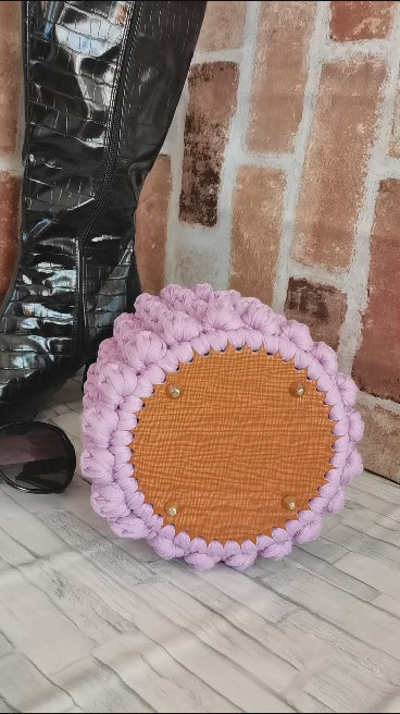 Introducing the Candy Bag - a masterpiece of durability and fashion, thoughtfully handcrafted to stand out from the crowd. Made from high-quality pleather and 100% cotton yarn, this cylindrical bag in charming Lilac Purple is a testament to both style and substance. Its name is derived from the unique crochet stitches that resemble delectable popcorn or candy, making it a truly special and distinctive piece.
