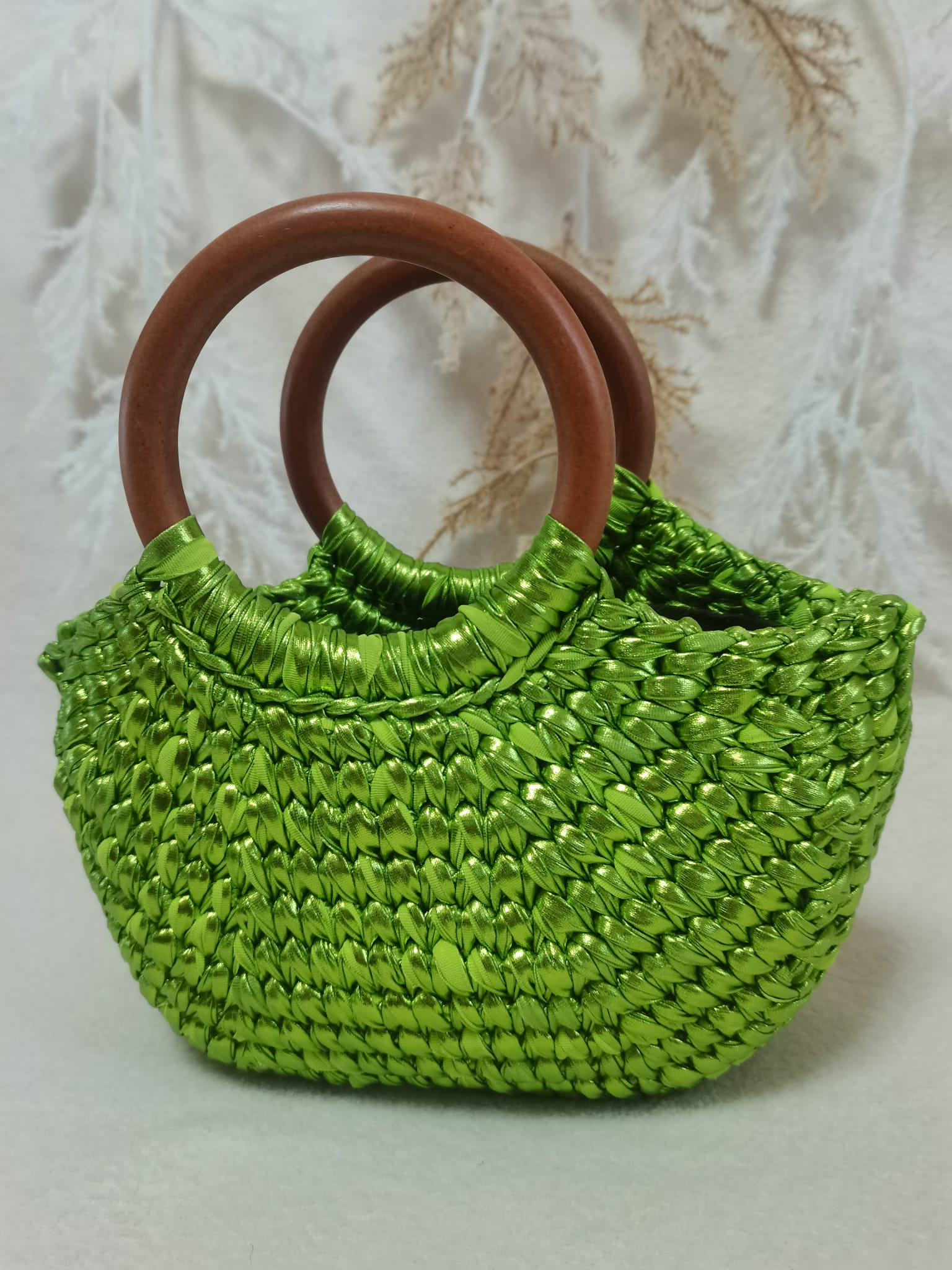Product Description: Introducing the Emberlyn Bag - a stunning fusion of durability and fashion, meticulously handcrafted for those who seek a touch of elegance in their everyday accessories. Made from luxurious metallic yarn in a captivating shade of Green, this crochet bag is more than an accessory; it's a statement piece that adds a touch of opulence to your style.