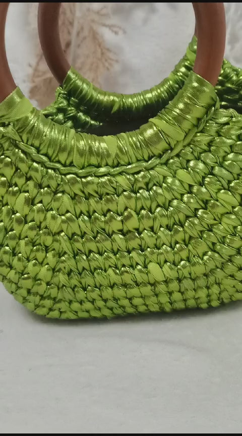 Elevate your style with the Emberlyn Bag, a handmade crochet masterpiece that exudes both durability and glamour. Make a statement with this Green metallic wonder, perfect for any occasion.